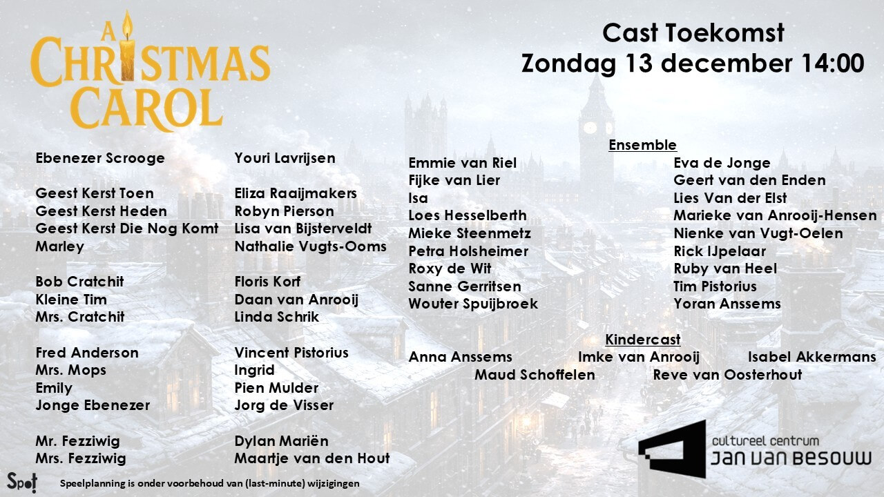 Let op: SPOT! speelt A Christmas Carol met twee verschillende casts. Kom je speciaal voor iemand kijken? Controleer dan goed welke cast jouw voorstelling speelt. Deze voorstelling wordt gespeeld door Cast Toekomst.