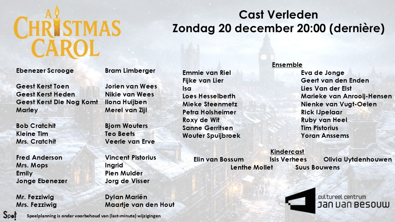 Let op: SPOT! speelt A Christmas Carol met twee verschillende casts. Kom je speciaal voor iemand kijken? Controleer dan goed welke cast jouw voorstelling speelt. Deze voorstelling wordt gespeeld door Cast Verleden.