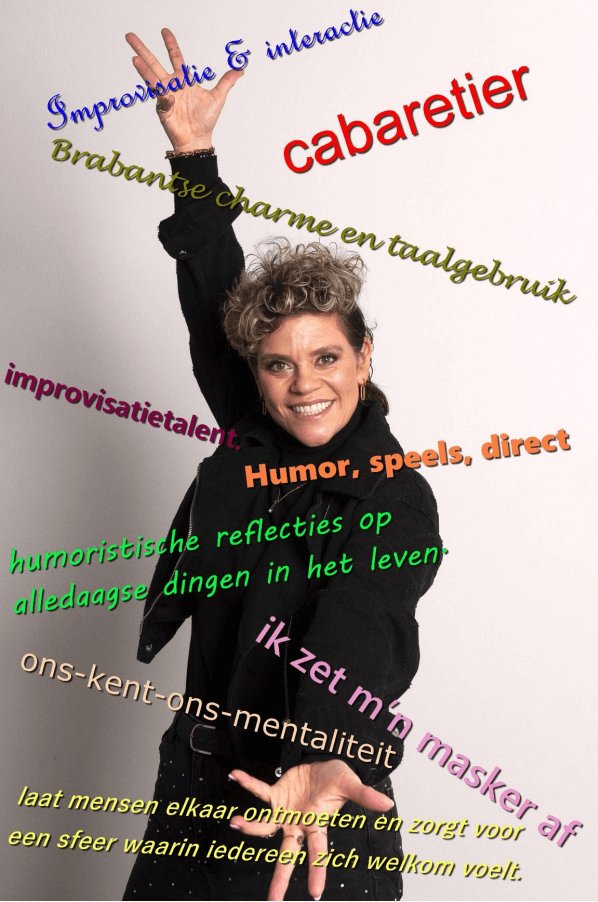 Karin Dirkx brengt een sprankelende mix van haar twee populaire voorstellingen. Een middag waarin niets vastligt, behalve de garantie op plezier, herkenning en veel lachen. Met haar scherpe humor, warme mensenkennis en echte Brabantse ons-kent-ons-gevoel voelt Karin haar publiek feilloos aan. Ze brengt beweging in de zaal, laat mensen elkaar ontmoeten en zorgt voor een sfeer waarin iedereen zich welkom voelt.