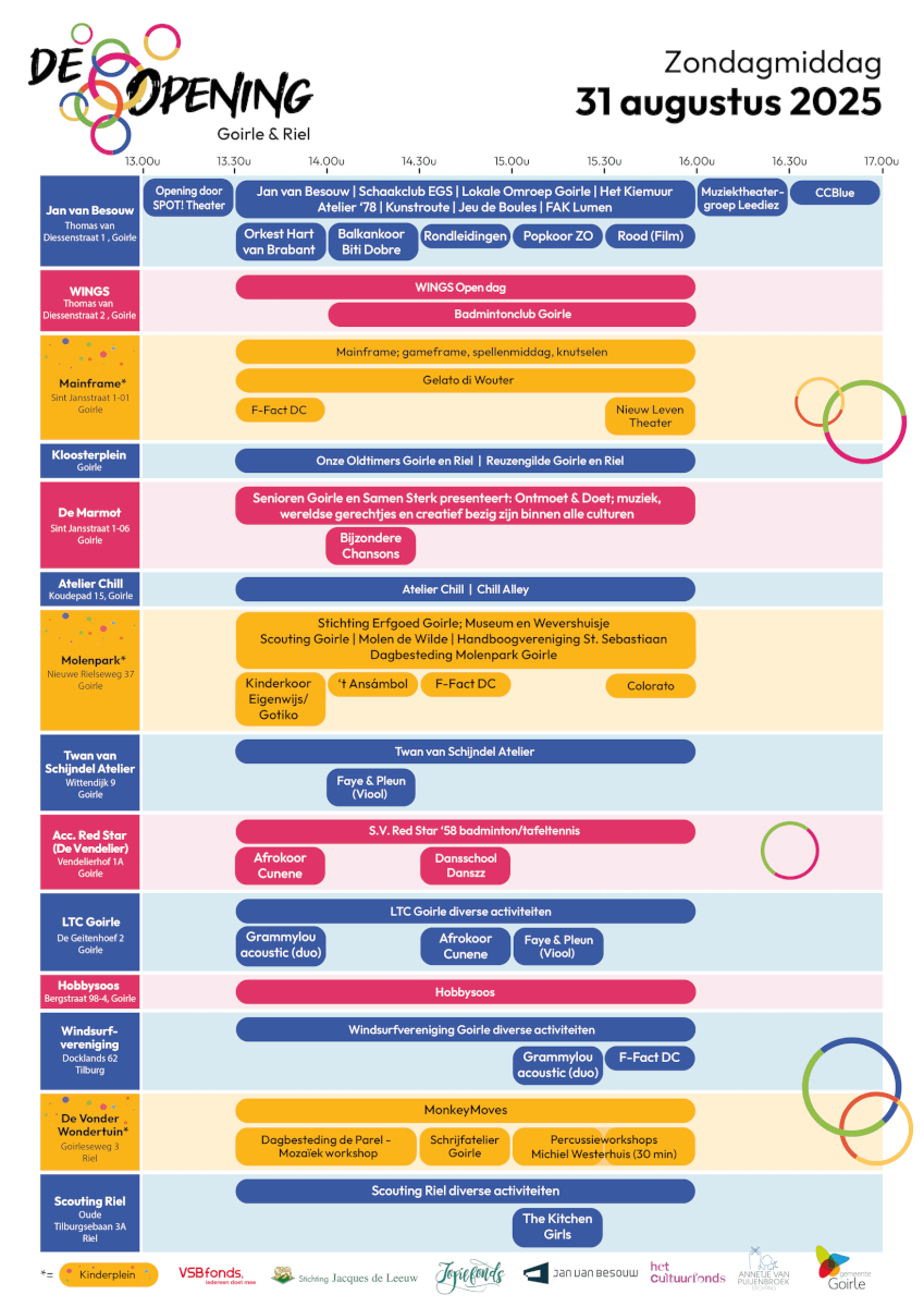 Na een oproep aan elke cultuur- en sportaanbieder, -maker, -beoefenaar, -locatie, -liefhebber in Goirle en Riel hebben we ook dit jaar weer een programma kunnen samenstellen met meer dan 40 activiteiten, verspreid over 14 locaties! Er zijn activiteiten op het gebied van cultuur, sportverenigingen presenteren zich en buurtinitiatieven laten zien wat zij dit seizoen gaan organiseren! Het tijdschema volgt in augustus.