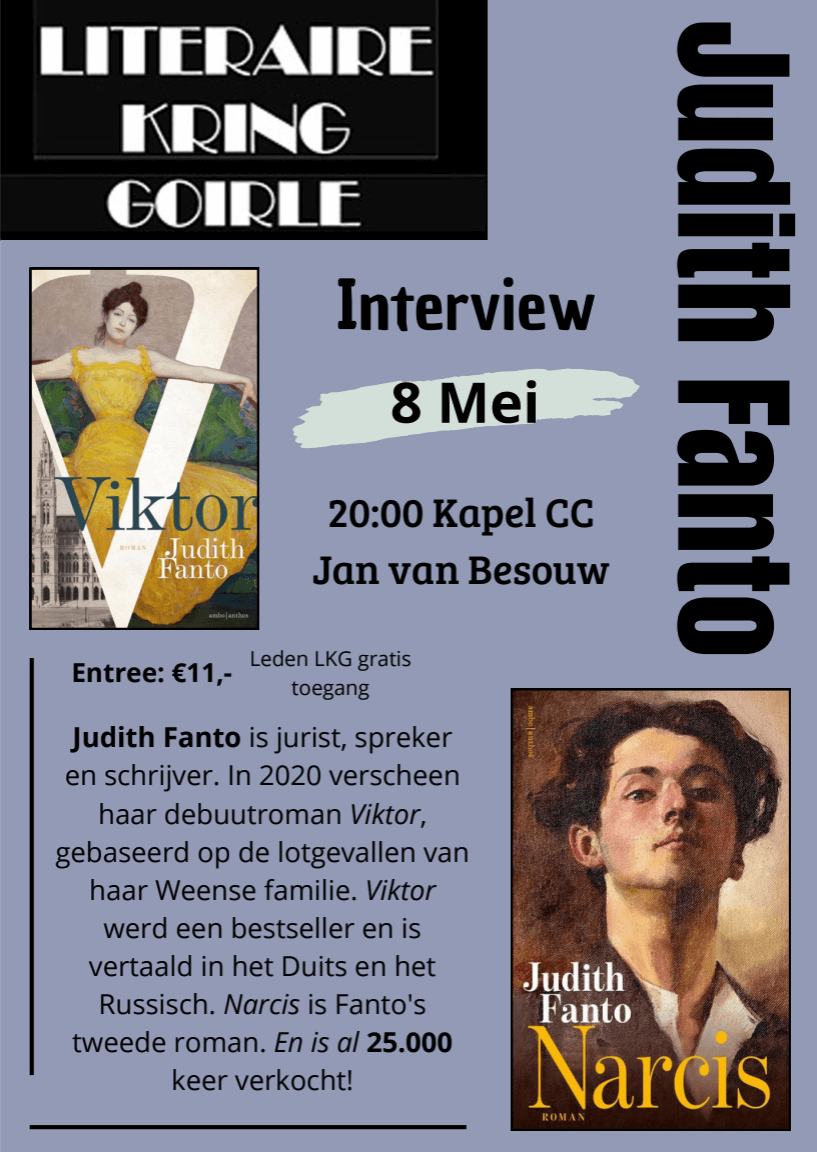Op vrijdag 8 mei 2026 is de schrijver Judith Fanto te gast bij de Literaire Kring Goirle in Jan van Besouw.