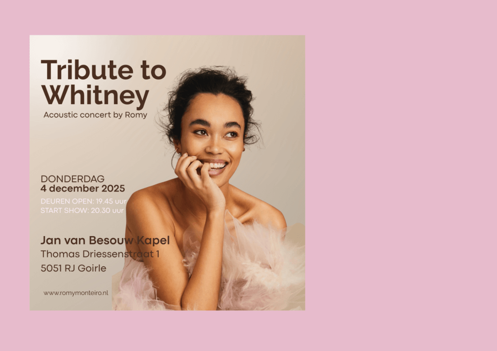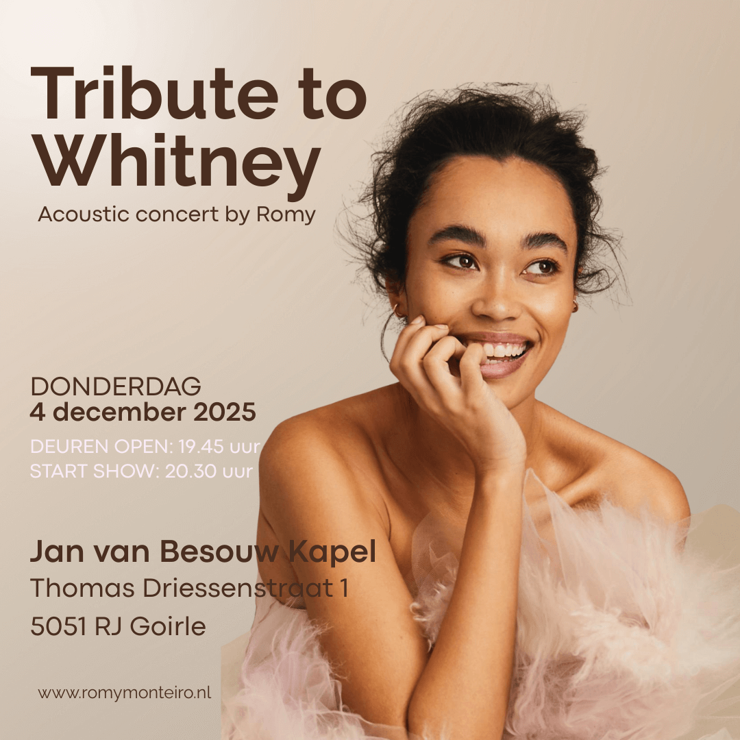 Op 27 september is het precies 10 jaar geleden dat de musical The Bodyguard in première ging. Voor Romy Monteiro betekende dit haar grote doorbraak. Whitney Houston werd niet alleen haar icoon, maar ook haar artistieke voorbeeld – haar stem en muziek zijn sindsdien onlosmakelijk met Romy’s carrière verbonden. Daarom start Romy op deze bijzondere datum haar nieuwe tour: Tribute to Whitney Acoustic. Een intieme en akoestische ode aan Whitney Houston, enkel begeleid door een pianist. De muziek klinkt zoals je Romy nog nooit gehoord hebt: kwetsbaar, krachtig en dichtbij. De concerten vinden plaats in karaktervolle, sfeervolle kerken met maximaal 300 zitplaatsen – waardoor iedere show een unieke, persoonlijke ervaring wordt.